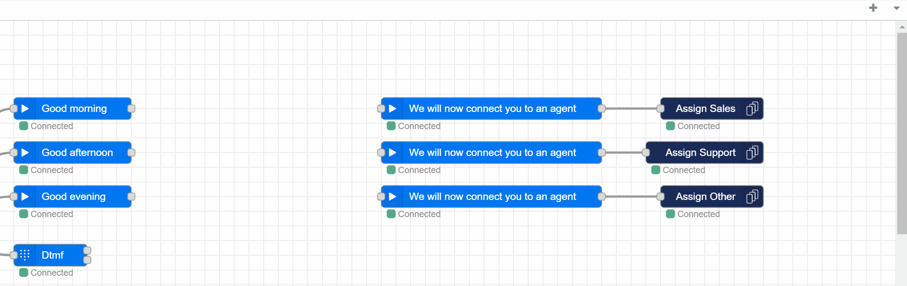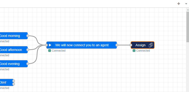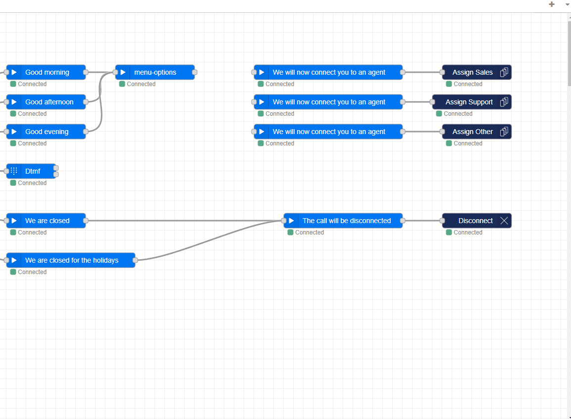 - Link the outputs of the Business hours node to the DTMF node, except the outside business hours one.