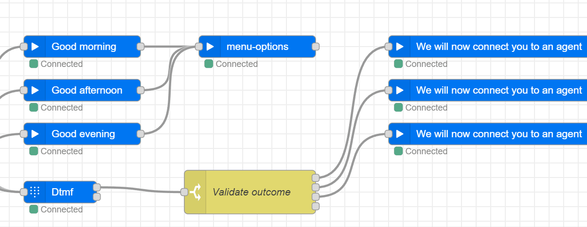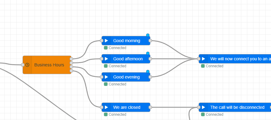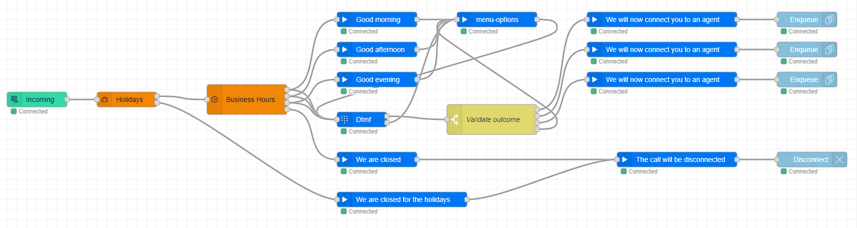 [{"id":"ed1a1487fa671bde","type":"tab","label":"Learn - Setup an IVR menu","disabled":false,"info":"","env":[]},{"id":"ca12d52f1eace396","type":"anywhere365-incoming","z":"ed1a1487fa671bde","name":"","address":"bc57cd8d-e625-4006-af08-6f2d79676d41","x":220,"y":280,"wires":[["f365675421cf10ef"]]},{"id":"c1eded3fe02162b3","type":"anywhere365-play","z":"ed1a1487fa671bde","name":"Good morning","dialogueId":"dialogue.id","dialogueIdType":"msg","audioSource":"audio-source-url","valueUrl":"https://dialoguestudio.anywhere365.io/media/learn-examples/good-morning.wav","valueUrlType":"str","repeat":"0","repeatType":"num","x":900,"y":120,"wires":[["ee07d3244e28037f"]]},{"id":"d299032ef90ce154","type":"anywhere365-play","z":"ed1a1487fa671bde","name":"We will now connect you to an agent","dialogueId":"dialogue.id","dialogueIdType":"msg","audioSource":"audio-source-url","valueUrl":"https://dialoguestudio.anywhere365.io/media/learn-examples/we-will-now-connect-you-to-an-agent.wav","valueUrlType":"str","repeat":"0","repeatType":"num","x":1470,"y":120,"wires":[["572400ed62ebb731"]]},{"id":"dd07dfb831dae89b","type":"anywhere365-settings-bh","z":"ed1a1487fa671bde","name":"","timezone":"Europe/Amsterdam","timezonefilter":"Europe/Amsterdam","businessHours":[{"operator":"weekdays","operands":{"days":[true,true,true,true,true,false,false],"startTime":{"type":"time","value":"09:00"},"endTime":{"type":"time","value":"12:00"}},"label":"Monday, Tuesday, Wednesday, Thursday, Friday (09:00-12:00)"},{"operator":"weekdays","operands":{"days":[true,true,true,true,true,false,false],"startTime":{"type":"time","value":"12:00"},"endTime":{"type":"time","value":"18:00"}},"label":"Monday, Tuesday, Wednesday, Thursday, Friday (12:00-18:00)"},{"operator":"weekdays","operands":{"days":[true,true,true,true,true,false,false],"startTime":{"type":"time","value":"18:00"},"endTime":{"type":"time","value":"21:00"}},"label":"Monday, Tuesday, Wednesday, Thursday, Friday (18:00-21:00)"},{"operator":"otherwise","operands":{},"label":"otherwise"}],"stopOnFirstMatch":true,"time":"","timeType":"msgInput","outputs":4,"x":640,"y":280,"wires":[["c1eded3fe02162b3","caa97175ce049771"],["c3e1b8cbe4bd0c9b","caa97175ce049771"],["22febc36828c1f38","caa97175ce049771"],["4b3c015ef4f4e1bd"]]},{"id":"c3e1b8cbe4bd0c9b","type":"anywhere365-play","z":"ed1a1487fa671bde","name":"Good afternoon","dialogueId":"dialogue.id","dialogueIdType":"msg","audioSource":"audio-source-url","valueUrl":"https://dialoguestudio.anywhere365.io/media/learn-examples/good-afternoon.wav","valueUrlType":"str","repeat":"0","repeatType":"num","x":900,"y":180,"wires":[["ee07d3244e28037f"]]},{"id":"22febc36828c1f38","type":"anywhere365-play","z":"ed1a1487fa671bde","name":"Good evening","dialogueId":"dialogue.id","dialogueIdType":"msg","audioSource":"audio-source-url","valueUrl":"https://dialoguestudio.anywhere365.io/media/learn-examples/good-evening.wav","valueUrlType":"str","repeat":"0","repeatType":"num","x":900,"y":240,"wires":[["ee07d3244e28037f"]]},{"id":"4b3c015ef4f4e1bd","type":"anywhere365-play","z":"ed1a1487fa671bde","name":"We are closed","dialogueId":"dialogue.id","dialogueIdType":"msg","audioSource":"audio-source-url","valueUrl":"https://dialoguestudio.anywhere365.io/media/learn-examples/we-are-closed-for-today.wav","valueUrlType":"str","repeat":"0","repeatType":"num","x":900,"y":400,"wires":[["1dfb7fb46035062c"]]},{"id":"1dfb7fb46035062c","type":"anywhere365-play","z":"ed1a1487fa671bde","name":"The call will be disconnected","dialogueId":"dialogue.id","dialogueIdType":"msg","audioSource":"audio-source-url","valueUrl":"https://dialoguestudio.anywhere365.io/media/learn-examples/the-call-will-be-disconnected.wav","valueUrlType":"str","repeat":"0","repeatType":"num","x":1500,"y":400,"wires":[["b26eb6b86f542d0f"]]},{"id":"b26eb6b86f542d0f","type":"anywhere365-disconnect","z":"ed1a1487fa671bde","name":"","dialogueId":"dialogue.id","dialogueIdType":"msg","x":1770,"y":400,"wires":[]},{"id":"1ec9f5a0877da31f","type":"anywhere365-play","z":"ed1a1487fa671bde","name":"We are closed for the holidays","dialogueId":"dialogue.id","dialogueIdType":"msg","audioSource":"audio-source-url","valueUrl":"https://dialoguestudio.anywhere365.io/media/learn-examples/we-are-closed-for-the-holidays.wav","valueUrlType":"str","repeat":"0","repeatType":"num","x":950,"y":480,"wires":[["1dfb7fb46035062c"]]},{"id":"f365675421cf10ef","type":"anywhere365-settings-holidays","z":"ed1a1487fa671bde","name":"","timezone":"","timezonefilter":"","holidays":[{"operator":"days","operands":{"type":"specific","day":"1","month":"january","year":""}}],"time":"","timeType":"msgInput","x":400,"y":280,"wires":[["dd07dfb831dae89b"],["1ec9f5a0877da31f"]]},{"id":"caa97175ce049771","type":"anywhere365-askandwait","z":"ed1a1487fa671bde","name":"","outputMethod":"none","playFile":"","playFileType":"str","playRepeat":"0","playRepeatType":"num","inputMethod":"amount","tone":"","toneType":"str","amount":"1","amountType":"num","dialogueId":"dialogue.id","dialogueIdType":"msg","timeout":"30","timeoutType":"num","x":870,"y":320,"wires":[["d0e9f3f630c763f9"],["ee07d3244e28037f"]]},{"id":"4bb1babb315d1095","type":"anywhere365-play","z":"ed1a1487fa671bde","name":"We will now connect you to an agent","dialogueId":"dialogue.id","dialogueIdType":"msg","audioSource":"audio-source-url","valueUrl":"https://dialoguestudio.anywhere365.io/media/learn-examples/we-will-now-connect-you-to-an-agent.wav","valueUrlType":"str","repeat":"0","repeatType":"num","x":1470,"y":180,"wires":[["87811134711255a1"]]},{"id":"e19069d4637e8f37","type":"anywhere365-play","z":"ed1a1487fa671bde","name":"We will now connect you to an agent","dialogueId":"dialogue.id","dialogueIdType":"msg","audioSource":"audio-source-url","valueUrl":"https://dialoguestudio.anywhere365.io/media/learn-examples/we-will-now-connect-you-to-an-agent.wav","valueUrlType":"str","repeat":"0","repeatType":"num","x":1470,"y":240,"wires":[["dd0a656aed99a708"]]},{"id":"ee07d3244e28037f","type":"anywhere365