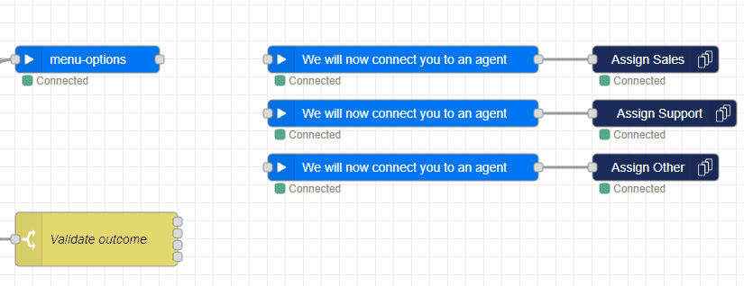 Based on the DTFM tone the customer enters, we need to make a choice. This can be done with a Switch node. We also want to catch if the customer enters an invalid choice. In that case, we want to replay the menu options. Follow these steps: