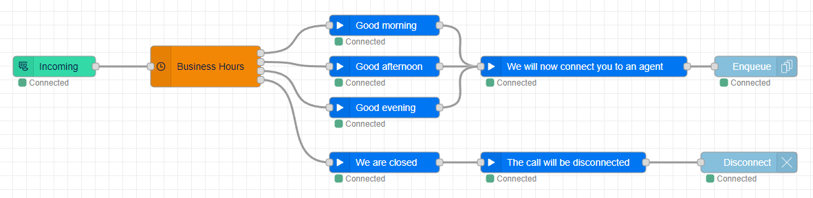 [{"id":"696e071723eb6783","type":"tab","label":"Learn - Setup an outside Business hour flow","disabled":false,"info":"","env":[]},{"id":"35ae1ea1be26f3c5","type":"anywhere365-incoming","z":"696e071723eb6783","name":"","address":"1265e7fd-6a2b-4c67-9e10-f76eac009fb7","x":220,"y":280,"wires":[["95bfe8800c95cfd6"]]},{"id":"0250a506c7213fbe","type":"anywhere365-play","z":"696e071723eb6783","name":"Good morning","dialogueId":"dialogue.id","dialogueIdType":"msg","audioSource":"audio-source-url","valueUrl":"https://dialoguestudio.anywhere365.io/media/learn-examples/good-morning.wav","valueUrlType":"str","repeat":"0","repeatType":"num","x":700,"y":220,"wires":[["37992d24c2b9640b"]]},{"id":"37992d24c2b9640b","type":"anywhere365-play","z":"696e071723eb6783","name":"We will now connect you to an agent","dialogueId":"dialogue.id","dialogueIdType":"msg","audioSource":"audio-source-url","valueUrl":"https://dialoguestudio.anywhere365.io/media/learn-examples/we-will-now-connect-you-to-an-agent.wav","valueUrlType":"str","repeat":"0","repeatType":"num","x":990,"y":280,"wires":[["e33c7325c294a1b5"]]},{"id":"95bfe8800c95cfd6","type":"anywhere365-settings-bh","z":"696e071723eb6783","name":"","timezone":"Europe/Amsterdam","timezonefilter":"Europe/Amsterdam","businessHours":[{"operator":"weekdays","operands":{"days":[true,true,true,true,true,false,false],"startTime":{"type":"time","value":"09:00"},"endTime":{"type":"time","value":"12:00"}},"label":"Monday, Tuesday, Wednesday, Thursday, Friday (09:00-12:00)"},{"operator":"weekdays","operands":{"days":[true,true,true,true,true,false,false],"startTime":{"type":"time","value":"12:00"},"endTime":{"type":"time","value":"18:00"}},"label":"Monday, Tuesday, Wednesday, Thursday, Friday (12:00-18:00)"},{"operator":"weekdays","operands":{"days":[true,true,true,true,true,false,false],"startTime":{"type":"time","value":"18:00"},"endTime":{"type":"time","value":"21:00"}},"label":"Monday, Tuesday, Wednesday, Thursday, Friday (18:00-21:00)"},{"operator":"otherwise","operands":{},"label":"otherwise"}],"stopOnFirstMatch":true,"time":"","timeType":"msgInput","outputs":4,"x":440,"y":280,"wires":[["0250a506c7213fbe"],["74f2a841d94b5f5f"],["c9819e64002f63d4"],["67ff3929528df204"]]},{"id":"74f2a841d94b5f5f","type":"anywhere365-play","z":"696e071723eb6783","name":"Good afternoon","dialogueId":"dialogue.id","dialogueIdType":"msg","audioSource":"audio-source-url","valueUrl":"https://dialoguestudio.anywhere365.io/media/learn-examples/good-afternoon.wav","valueUrlType":"str","repeat":"0","repeatType":"num","x":700,"y":280,"wires":[["37992d24c2b9640b"]]},{"id":"c9819e64002f63d4","type":"anywhere365-play","z":"696e071723eb6783","name":"Good evening","dialogueId":"dialogue.id","dialogueIdType":"msg","audioSource":"audio-source-url","valueUrl":"https://dialoguestudio.anywhere365.io/media/learn-examples/good-evening.wav","valueUrlType":"str","repeat":"0","repeatType":"num","x":700,"y":340,"wires":[["37992d24c2b9640b"]]},{"id":"67ff3929528df204","type":"anywhere365-play","z":"696e071723eb6783","name":"We are closed","dialogueId":"dialogue.id","dialogueIdType":"msg","audioSource":"audio-source-url","valueUrl":"https://dialoguestudio.anywhere365.io/media/learn-examples/we-are-closed-for-today.wav","valueUrlType":"str","repeat":"0","repeatType":"num","x":700,"y":420,"wires":[["0b0e13a12cea977b"]]},{"id":"0b0e13a12cea977b","type":"anywhere365-play","z":"696e071723eb6783","name":"The call will be disconnected","dialogueId":"dialogue.id","dialogueIdType":"msg","audioSource":"audio-source-url","valueUrl":"https://dialoguestudio.anywhere365.io/media/learn-examples/the-call-will-be-disconnected.wav","valueUrlType":"str","repeat":"0","repeatType":"num","x":960,"y":420,"wires":[["221c61c97d4dd177"]]},{"id":"221c61c97d4dd177","type":"anywhere365-disconnect","z":"696e071723eb6783","name":"","dialogueId":"dialogue.id","dialogueIdType":"msg","x":1230,"y":420,"wires":[]},{"id":"e33c7325c294a1b5","type":"anywhere365-enqueue","z":"696e071723eb6783","name":"","contactCenterSelectedOption":"contact-center-select","contactCenterSelect":"","contactCenterVariableType":"msg","requiredSkillSelectedOption":"required-skill-select","requiredSkillSelect":"","requiredSkillVariableType":"msg","dialogueId":"dialogue.id","dialogueIdType":"msg","x":1240,"y":280,"wires":[]}]